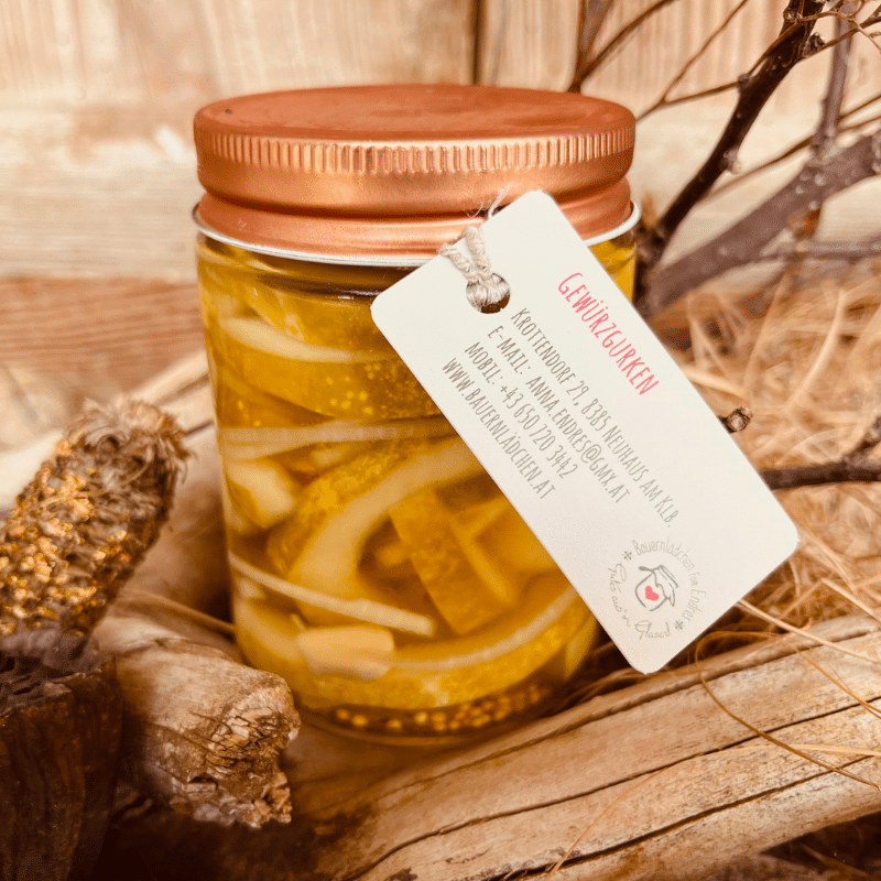 Gurken, Apfelessig, Zwiebel, Knoblauch, Rohrzucker, Salz, Ingwer, Dillsaat, Pfeffer, Nelken, Lorbeer, Piment, Senfkörner, Wacholderbeeren, Fenchel